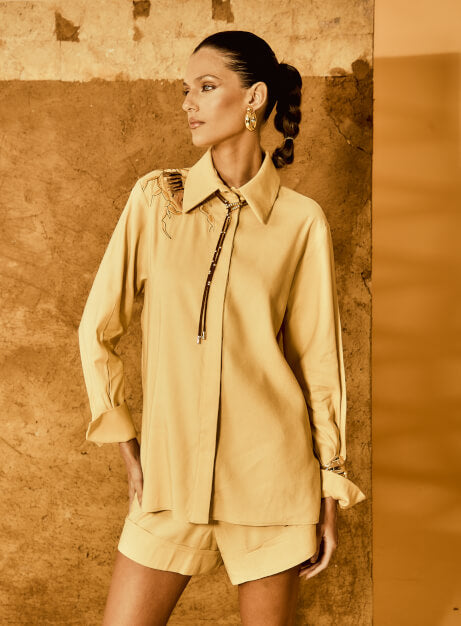 ° Blusa manga larga con aplicación bordada en un hombro ° 64% viscosa, 36% lino